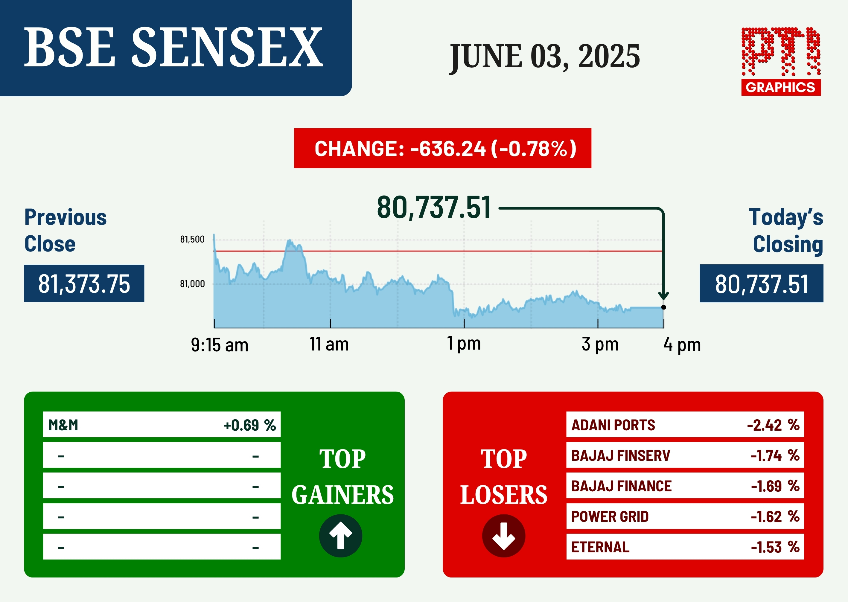 In a volatile trading session, the 30-share BSE index tanked 636.24 points or 0.78 per cent to settle at 80,737.51. During the day, it dropped 798.66 points or 0.98 per cent to 80,575.09.