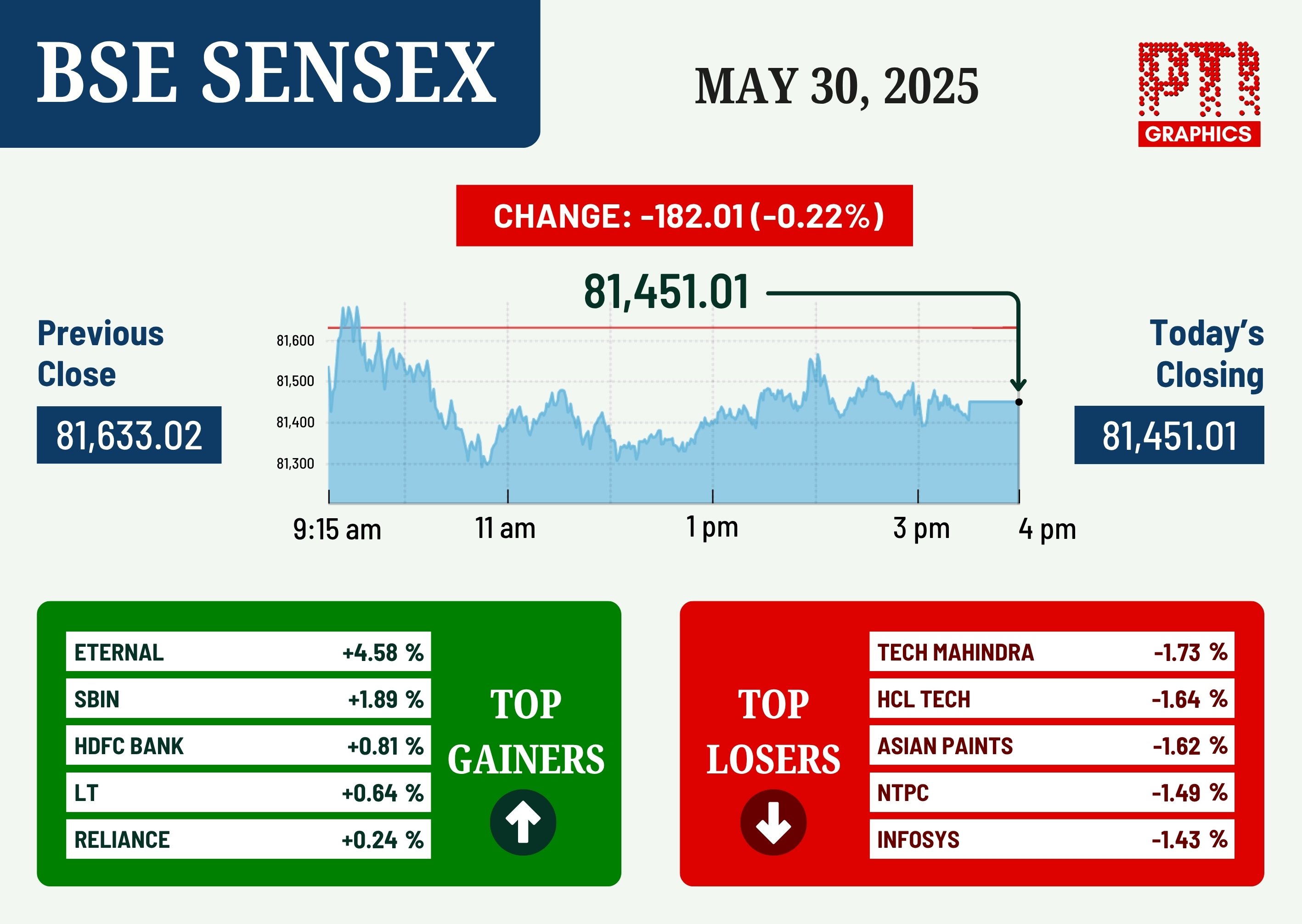 Mumbai, May 30 (PTI): Stock markets closed lower in a range-bound trade on Friday following losses in IT shares and sluggish trends in Asian markets due to trade uncertainty after a US appeals court temporarily reinstated reciprocal tariffs.