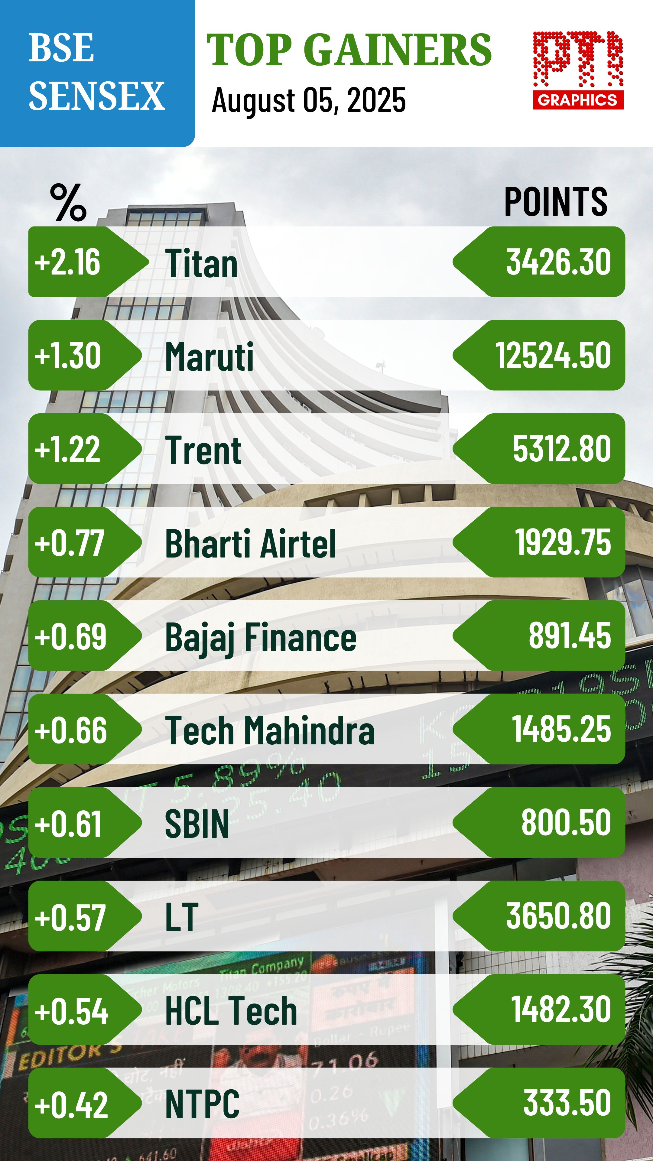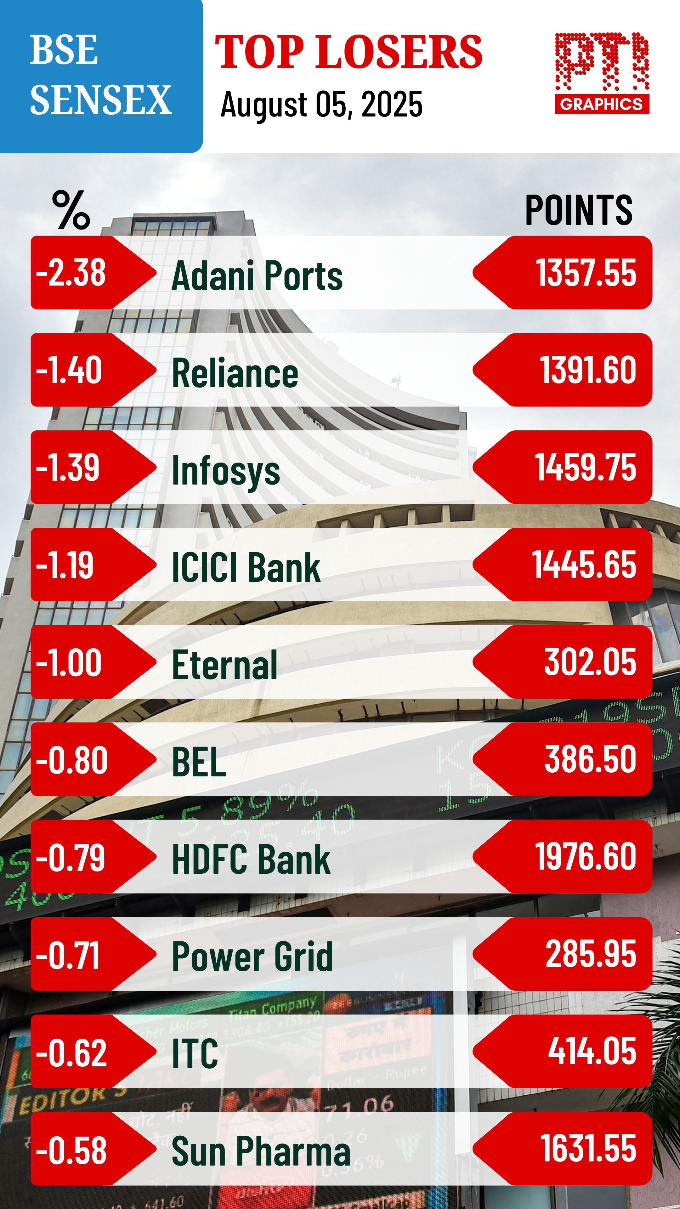 Mumbai, Aug 5 (PTI): Benchmark stock indices Sensex and Nifty closed lower on Tuesday following selling in oil & gas and banking shares ahead of the Reserve Bank's monetary policy announcement on August 6.
