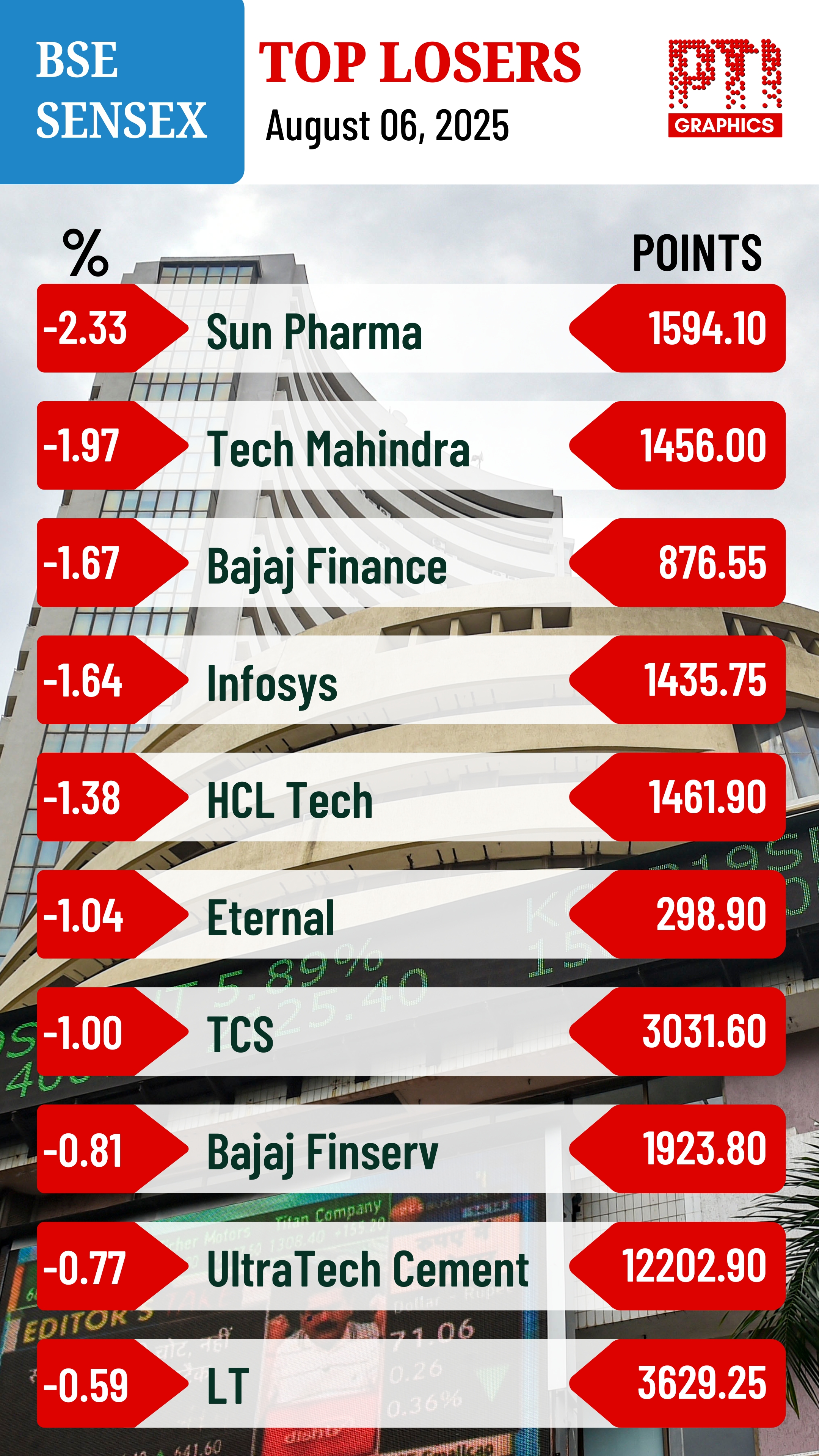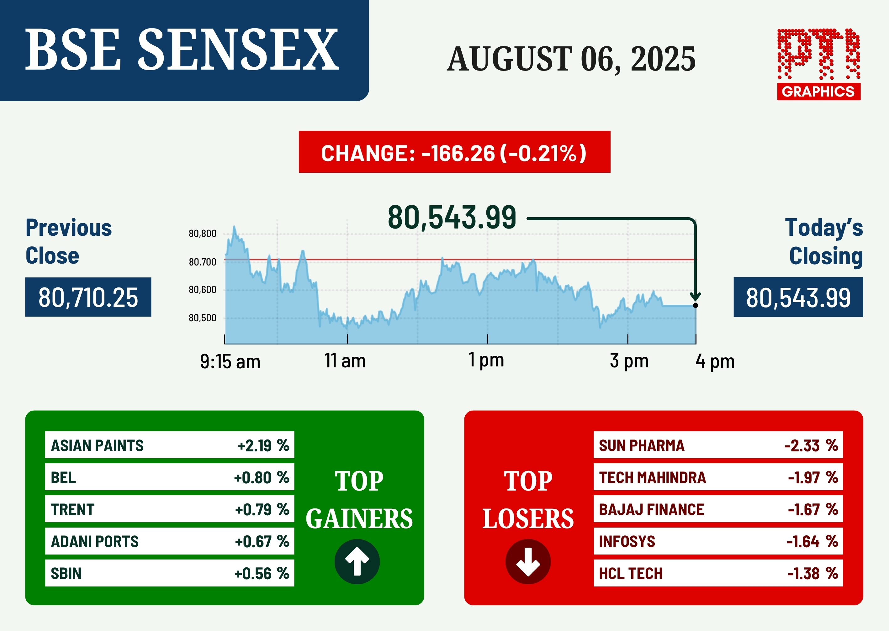 The 30-share BSE Sensex fell 166.26 points or 0.21 per cent to settle at 80,543.99 with 18 of its constituents ending lower and 12 with gains. During the day, it declined 261.43 points or 0.32 per cent to hit a low of 80,448.82.