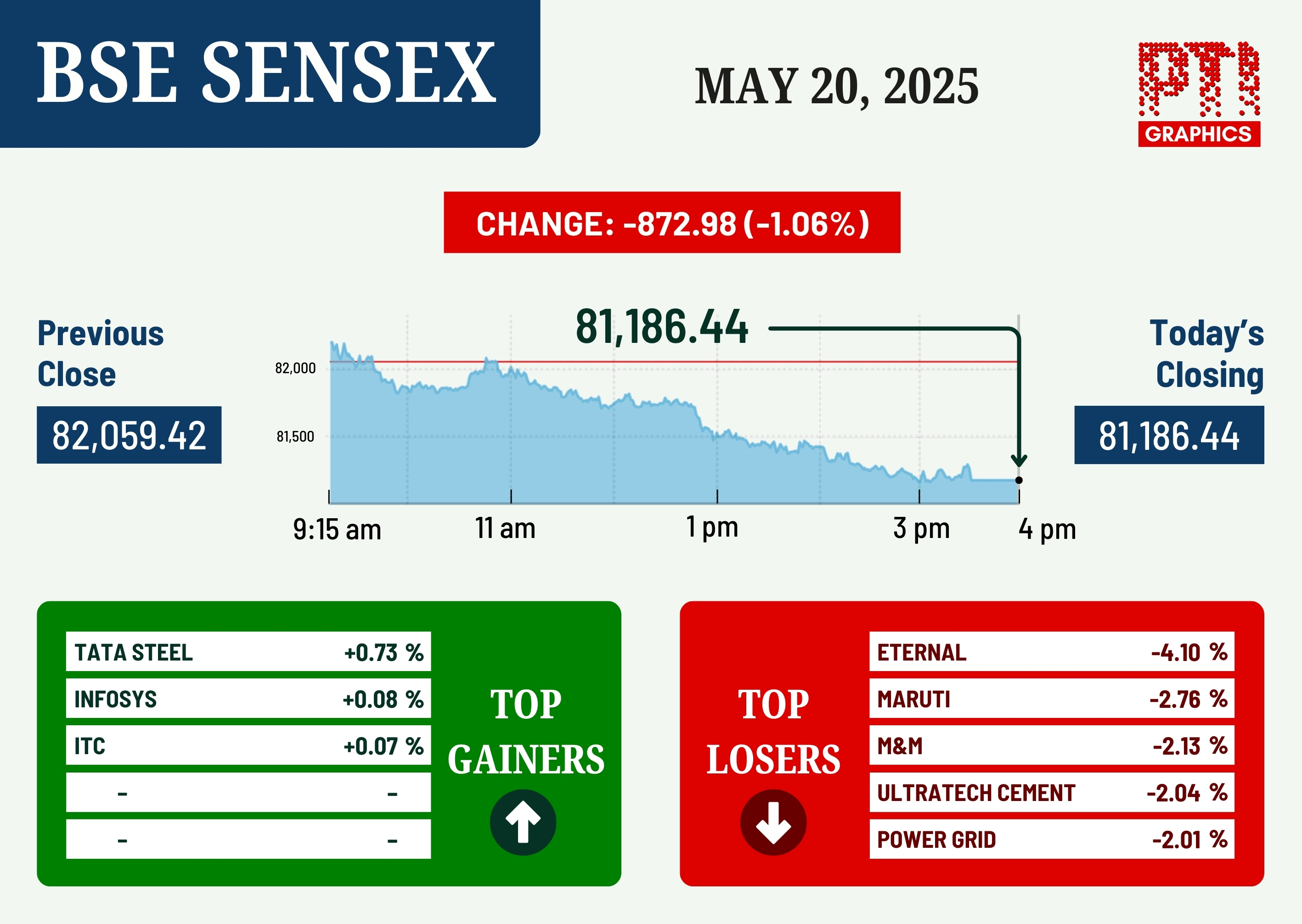 Retreating from early highs, the 30-share BSE Sensex tanked 872.98 points or 1.06 per cent to settle at 81,186.44 as 27 of its constituents closed lower and three with gains. During the day, it dropped 905.72 points or 1.10 per cent to 81,153.70 as profit taking emerged in auto, financials and defence stocks.