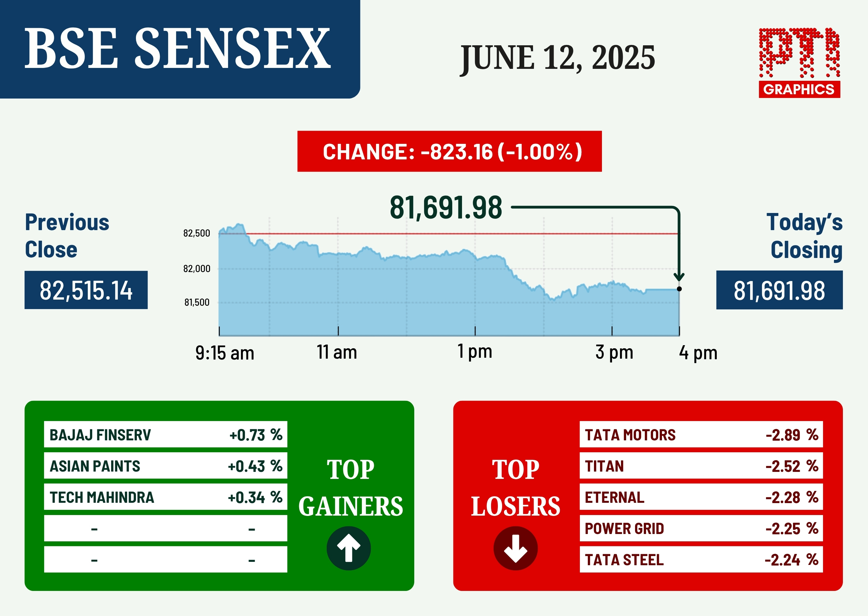 Mumbai, Jun 12 (PTI): Benchmark Sensex tanked 823 points on Thursday following a selloff in oil & gas, power and capital goods shares in tandem with weak global market trends amid growing tensions in the Middle East.