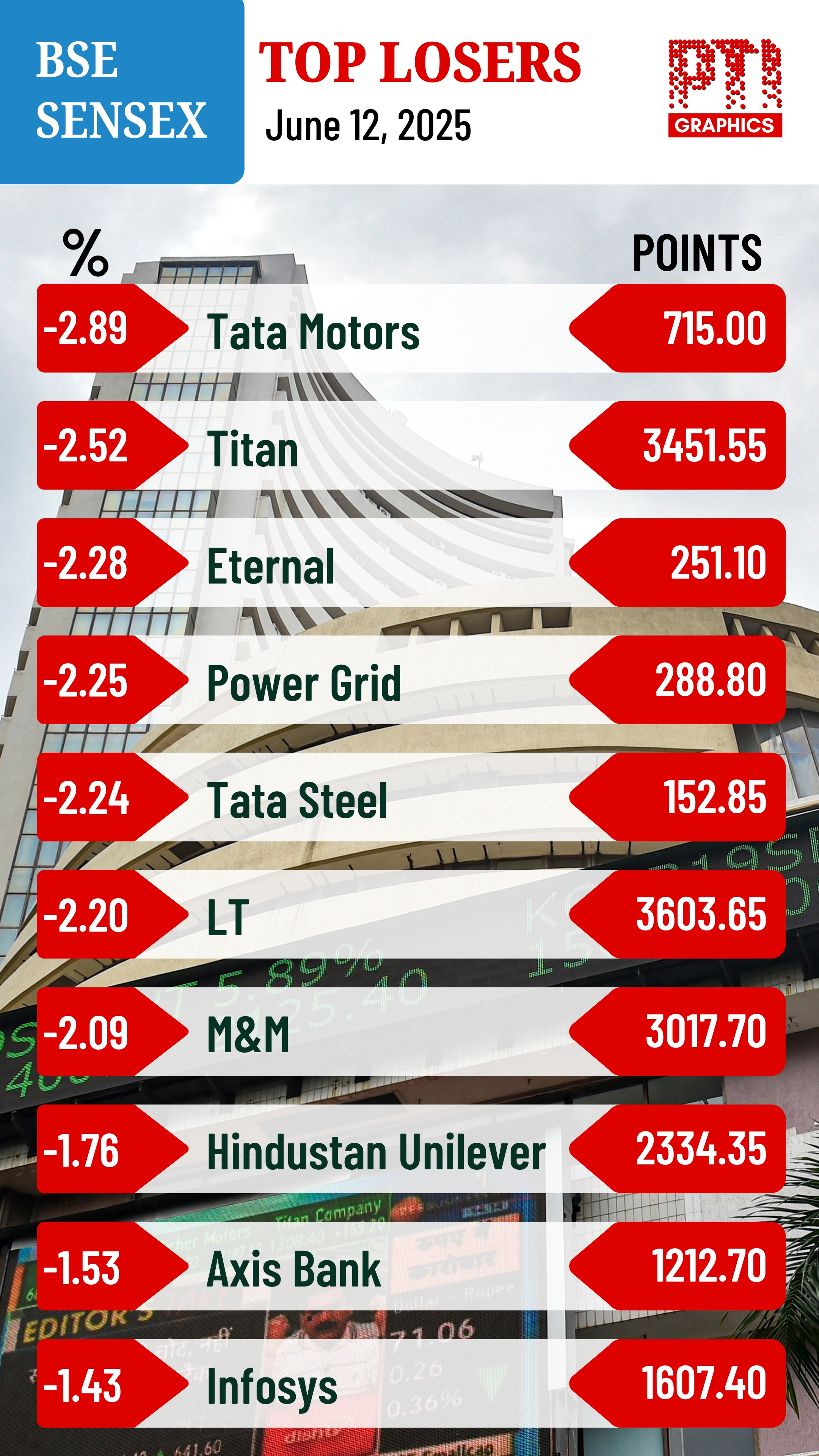 Prashanth Tapse, Senior VP (Research), Mehta Equities Ltd, said investors exited stocks at will weighed down by weak global sentiment coupled with the possibility of Israel attacking Iran and renewed tariff threat by US President Donald Trump".