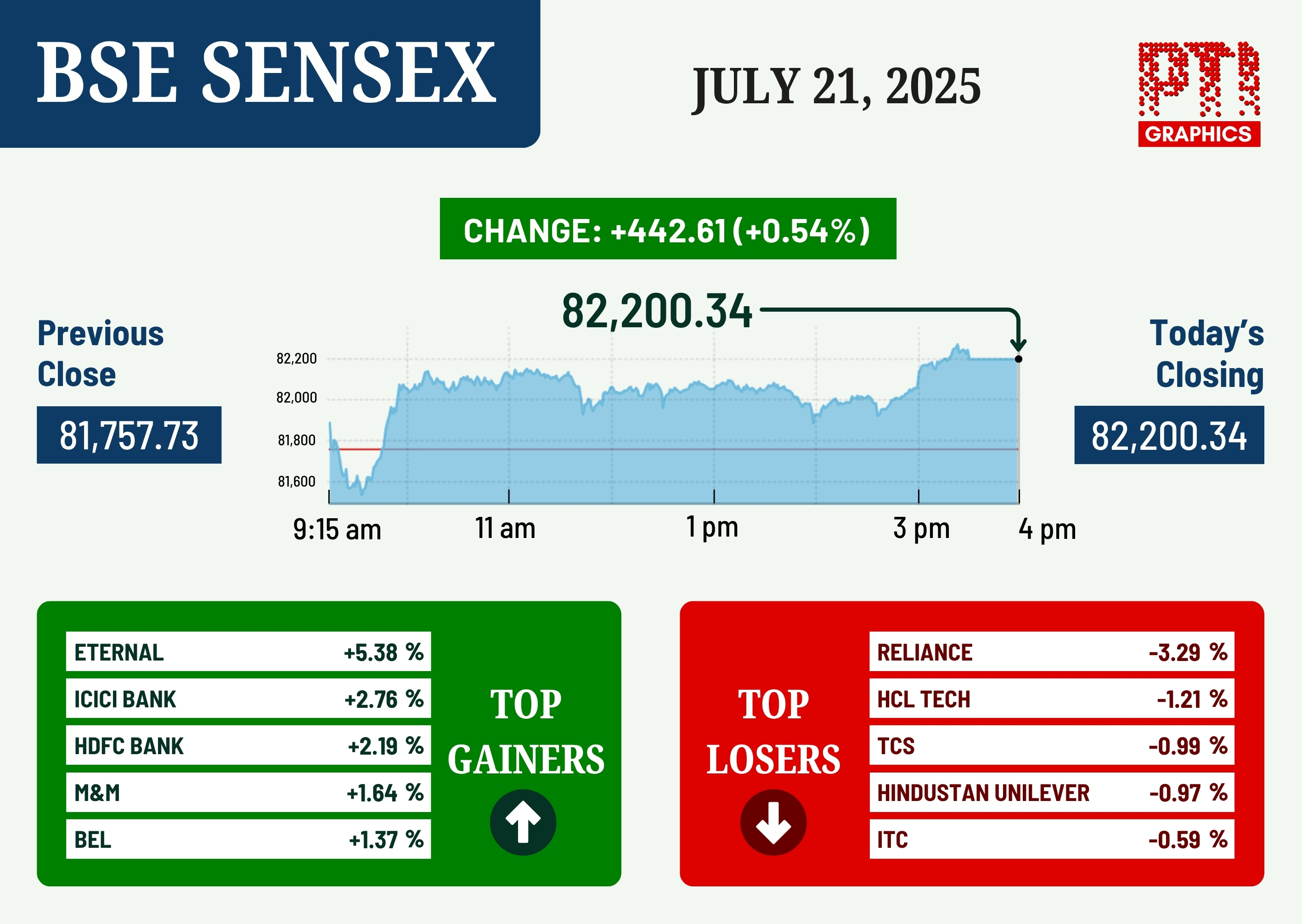Snapping the two-day falling streak, the 30-share BSE Sensex climbed 442.61 points or 0.54 per cent to settle at 82,200.34. During the day, it surged 516.3 points or 0.63 per cent to 82,274.03.