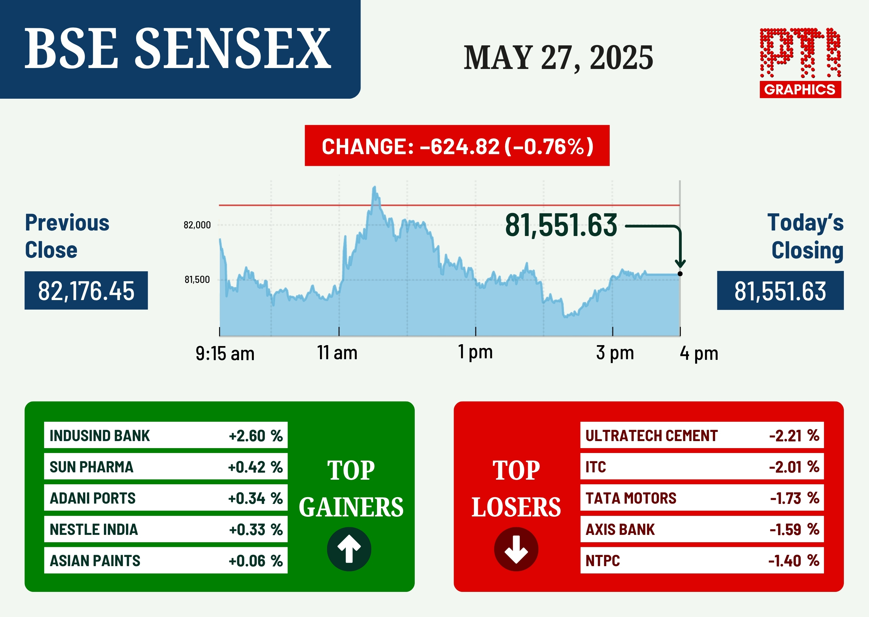 The 30-share BSE Sensex dropped 624.82 points or 0.76 per cent to settle at 81,551.63 in a volatile session. During the day, the barometer tanked 1,054.75 points or 1.28 per cent to 81,121.70. As many as 25 Sensex shares declined while five advanced.