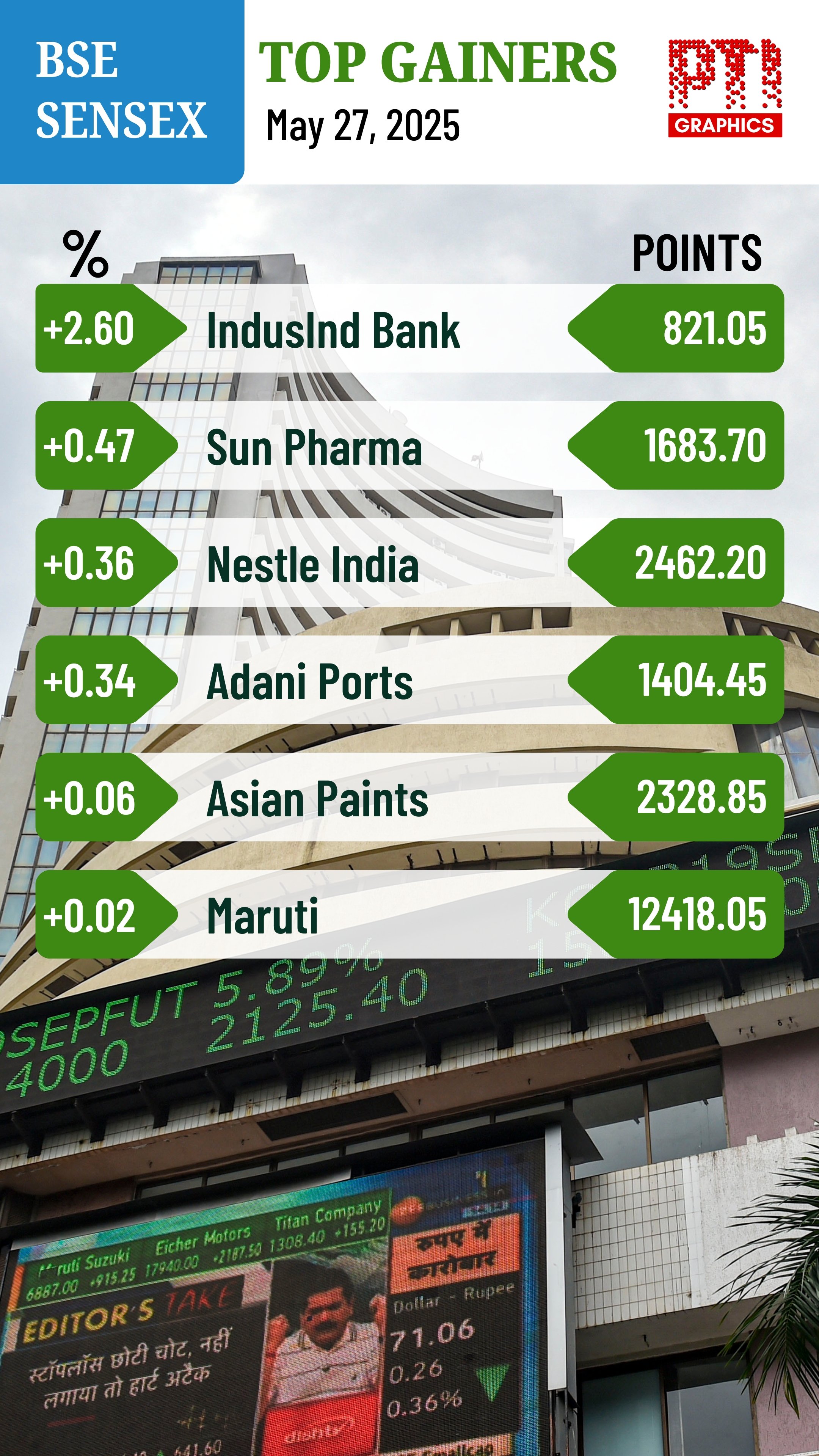 IndusInd Bank, Sun Pharma, Adani Ports, Nestle and Asian Paints were the gainers.