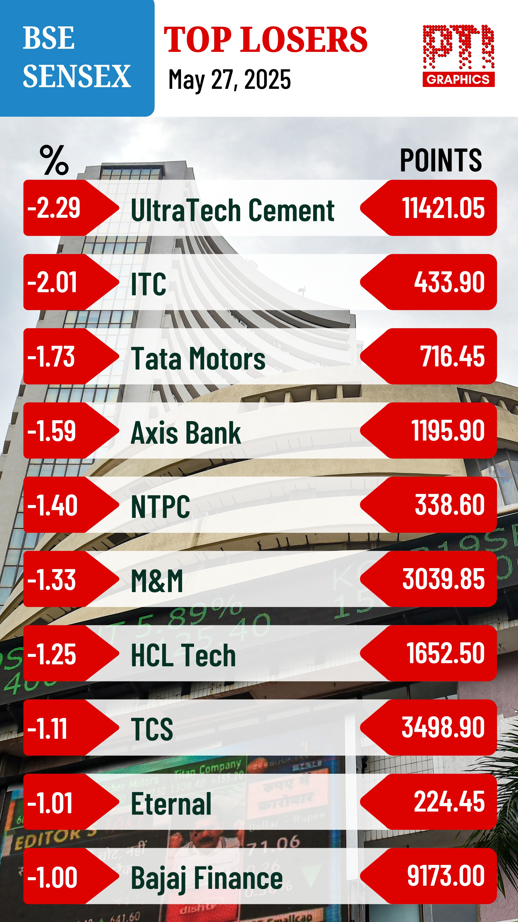 From the Sensex firms, UltraTech Cement fell the most by 2.21 per cent, followed by ITC which declined 2.01 per cent. Tata Motors, NTPC, Axis Bank, HCL Tech, Mahindra & Mahindra, HDFC Bank, ICICI Bank and Eternal were among the laggards.