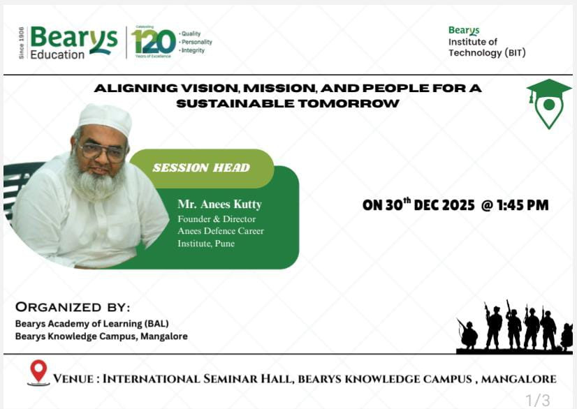 Mangaluru: As part of an institutional development initiative, a dedicated session for non-teaching staff was held at Bearys Institute of Technology, Bearys Knowledge Campus, on December 30, 2025, at the International Seminar Hall, led by renowned educator and international career mentor Anees Kutty.
