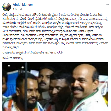 According to his Facebook post, "Mangaluru North MLA Moideen Bawa has added the activists of the communal organization Techi Ravi, Paddu and others --who are the prime accused in the murder case of Bijai madrasa's innocent Maulvi-- to Congress party by giving them the party flags and shawls at a function. This is the worst way of doing politics. Going to this extent for winning, has saddened me. The Congress party, which always speaks for the safety of minorities and secularism, is against communalism. Siddaramaiah must talk about this step of Moideen Bawa. Otherwise, people will decide in the election.