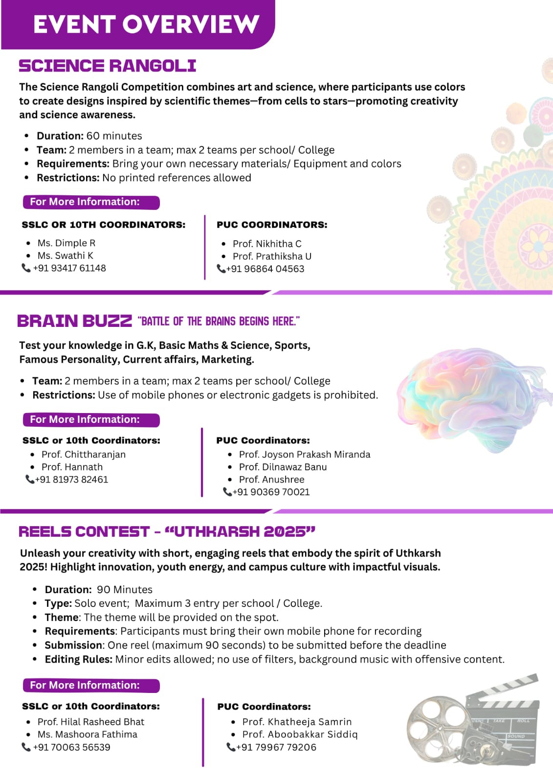 The competitions are open solely to SSLC/10th and II PUC/12th students. Free transportation will be available from Kasaragod, Manjeshwara, Talapady, Pumpwell, Thokkottu, Deralakatte, BC Road, Melkar, Mudipu, Uppinangady, Mani, Puttur, and Vittal. Participants are required to report by 9:00 AM.