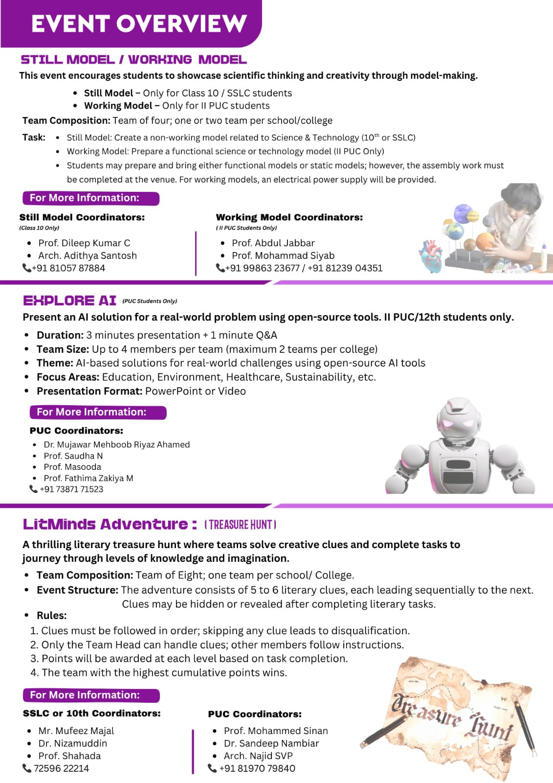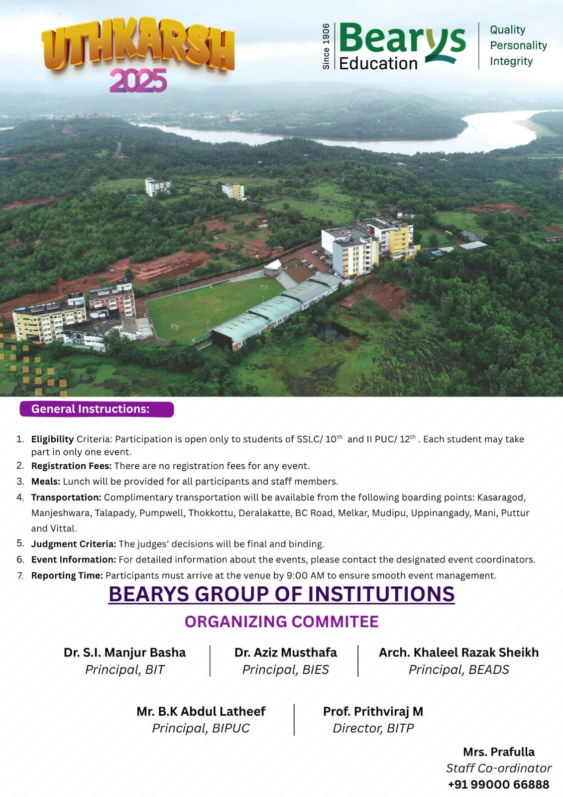The Organising Committee comprises Dr S.I. Manjur Basha (Principal, BIT), Dr Aziz Mustafa (Principal, BIES), Arch. Khaleel Razak Sheikh (Principal, BEADS), B.K. Abdul Latheef (Principal, BIPUC), Prof. Prithviraj M (Director, BITP), and staff coordinator Prafulla (Contact: +91 99000 66888).