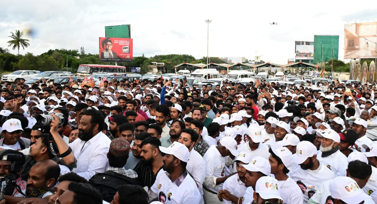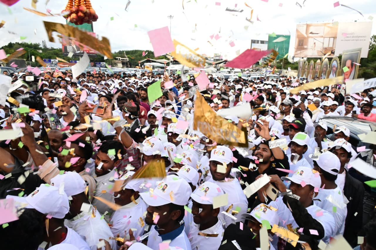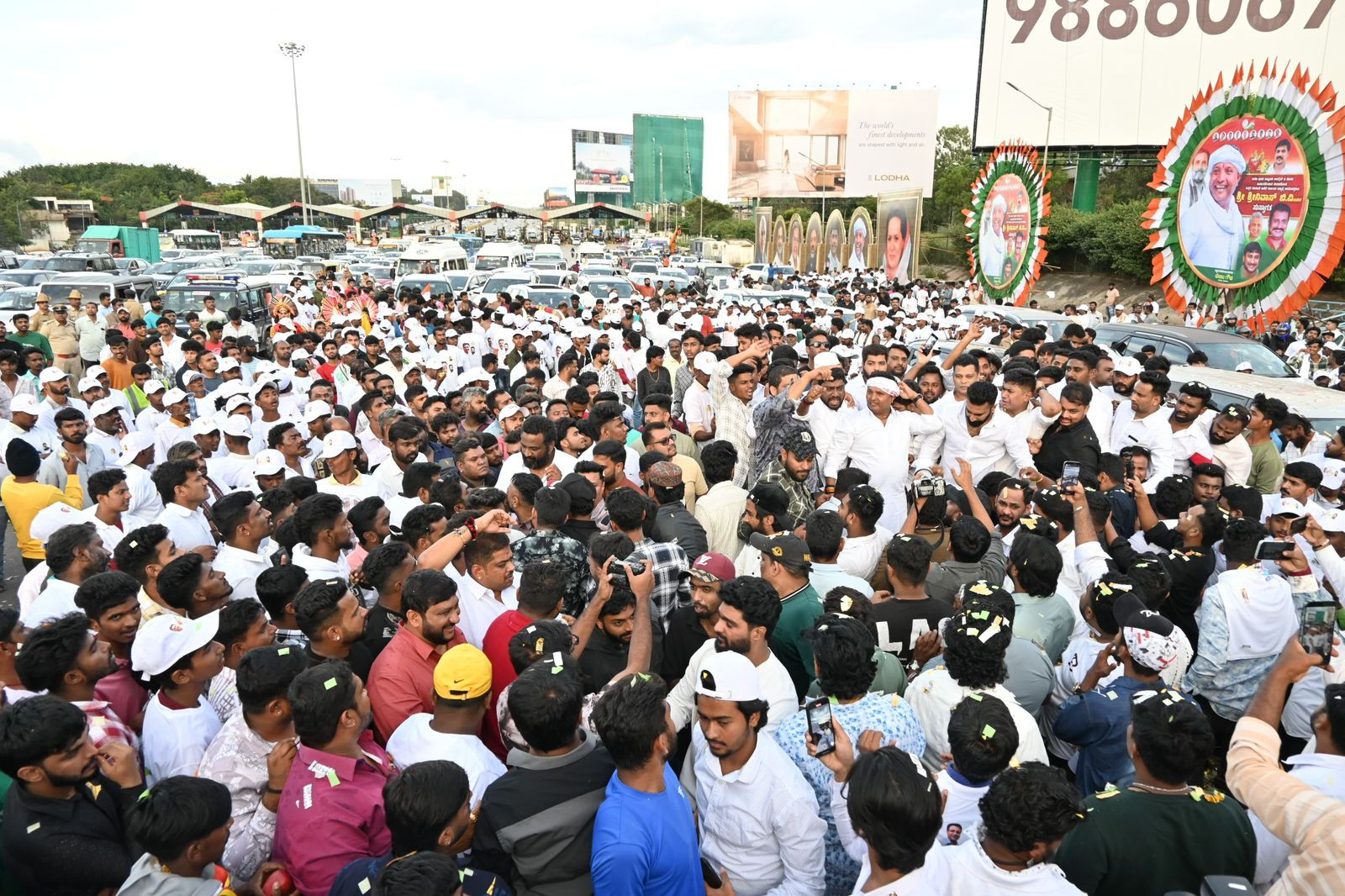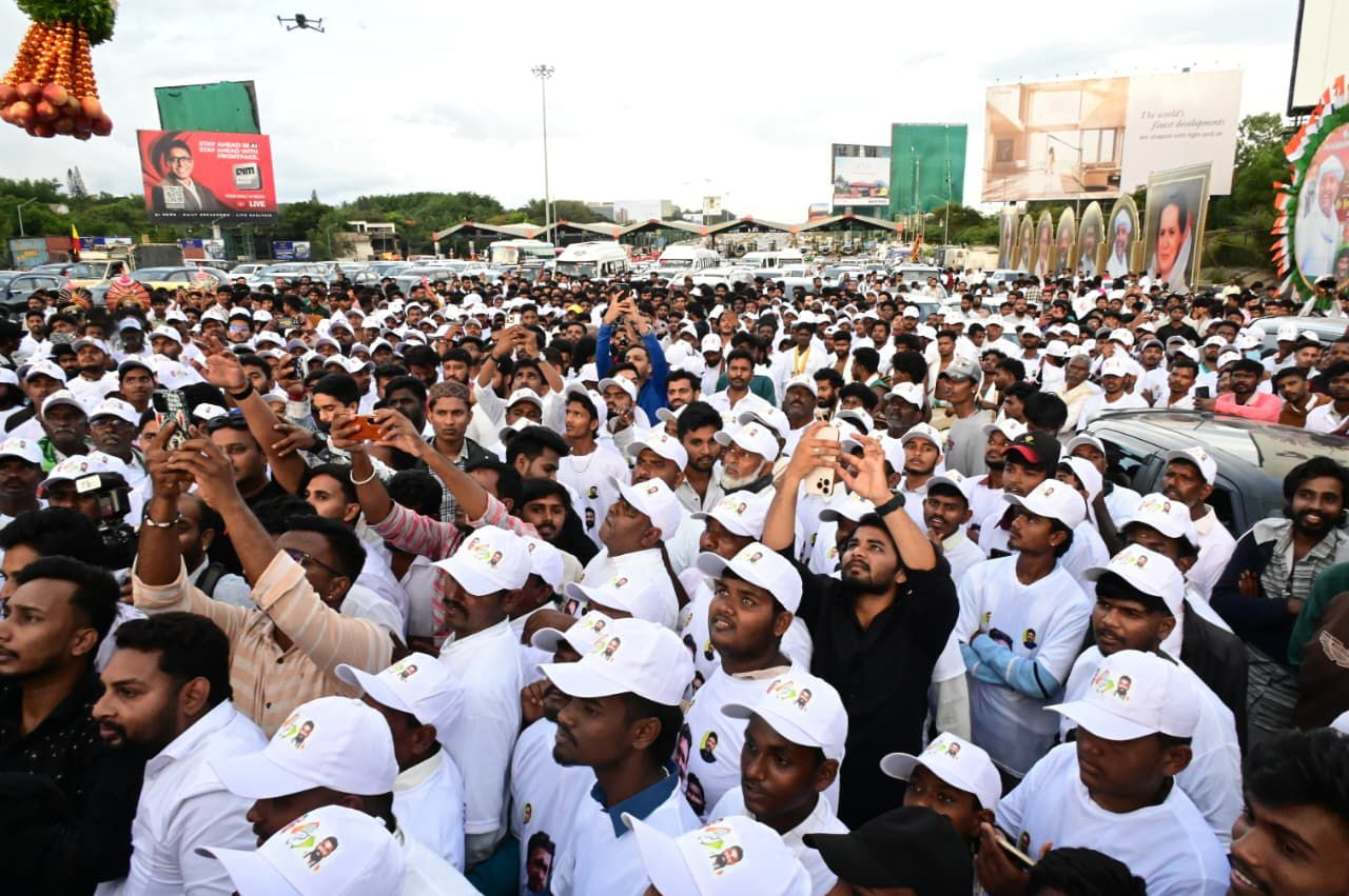 Following his arrival, party workers organised a large bike and car rally, forming a long convoy that accompanied him from the airport to the KPCC office. The rally extended for several kilometres, drawing sizeable gatherings along the route. Supporters showered him with flowers and offered greetings, creating a celebratory environment throughout the journey.