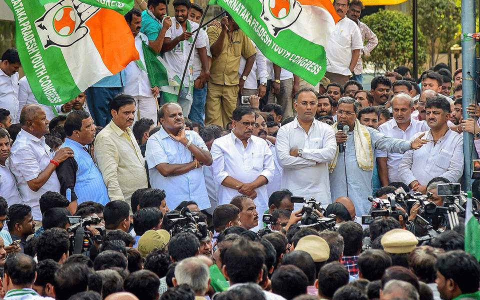 Bengaluru, Mar 28: Karnataka Chief Minister H D Kumaraswamy Thursday led a protest by the Congress-JDS ruling alliance in front of the Income Tax department here in a furious response to a statewide pre-dawn IT crackdown on his partymen and others.