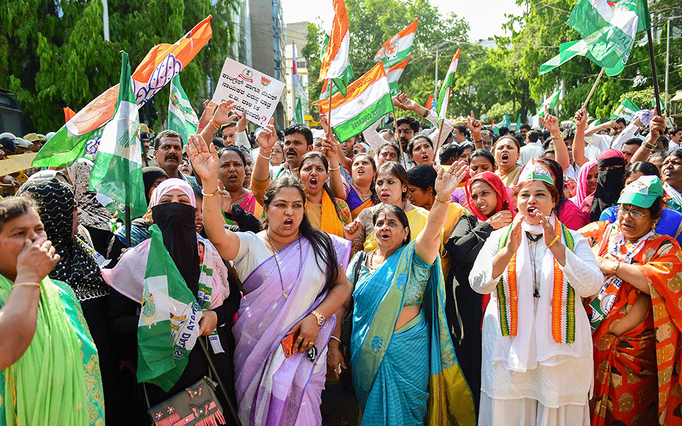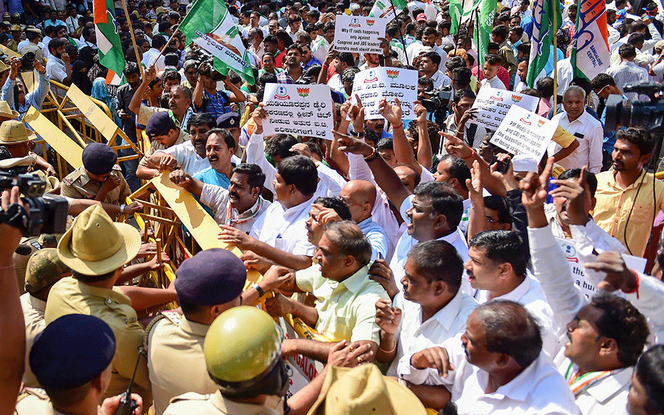 Raising slogans against Prime Minister Narendra Modi and waving party flags, the Congress and JD(S) activists gathered within hours after the IT raids with the help of CRPF personnel at 15 to 20 places including Bengaluru, Mandya, Mysuru, Hassan and Shimoga.