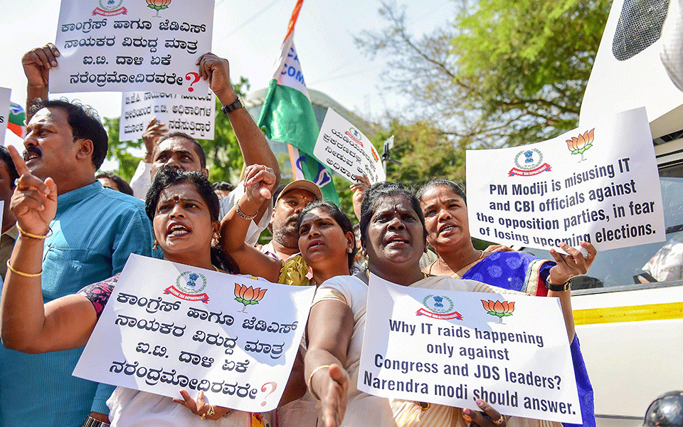 The ruling alliance was particularly angry as they alleged that the IT raids were carried out on JD(S) leaders overseeing the elections of Kumaraswamy's son Nikhil Kumaraswamy in Mandya and nephew Prajwal Revanna in Hassan.