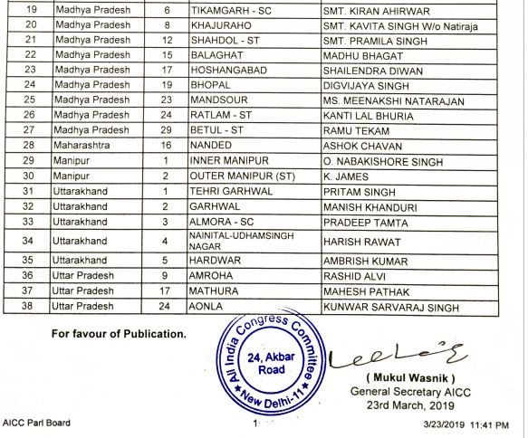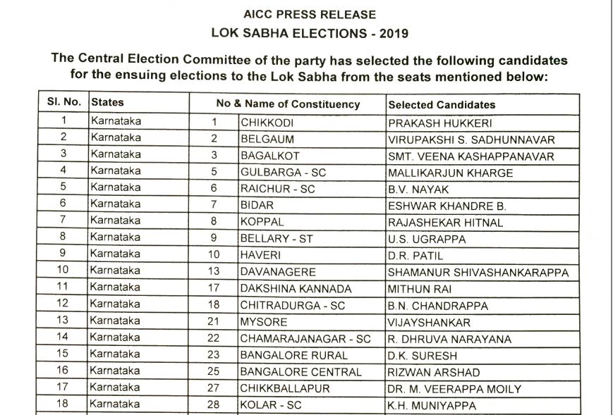 Chikkodi- Prakash Hukkeri, Belagavi- Virupakshi S Sadunavar, Bagalkot- Veena Kashappanavar, Gulbarga(SC)- Mallikarjun Kharge, Raichur(SC)- BV Nayak, Bidar- Eshwar Khandre, Koppal- Rajshekar Hitnal, Ballari(ST)- VS Ugrappa, Haveri- DR Patil, Davangere- Shamanoor Shivashankarappa, Dakshina Kannada- Mithun Rai, Chitradurga(SC)- BN Chandrappa, Mysuru-Kodagu- CH Vijayshankar, Chamarajnagar- R Dhruvanarayan, Bengaluru(Rural)- DK Suresh, Bengaluru(Central)- Rizwan Harshad, Chikballpur- DR.M. Veerappa Moily while KH Muniyappa was given ticket from Kolar (SC) by the party's high command.