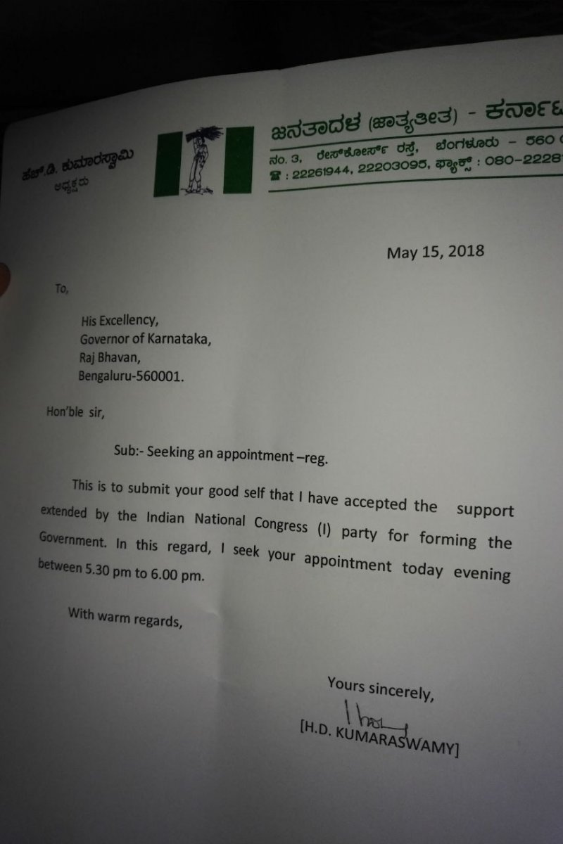Kumaraswamy is said to have mentioned in the letter that “I have accepted the support extended by the Congress to form a new government in Karnataka. In view of this, I wanted to meet you between 5.30 pm and 6 pm”, it is said in the letter.
