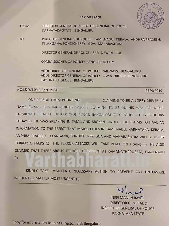He called the police control room in Bengaluru on Friday night and said 19 terrorists were holed up in a town in Tamil Nadu and were set to bomb cities, trains and buses in Andhra Pradesh, Telangana, Karnataka and Tamil Nadu.