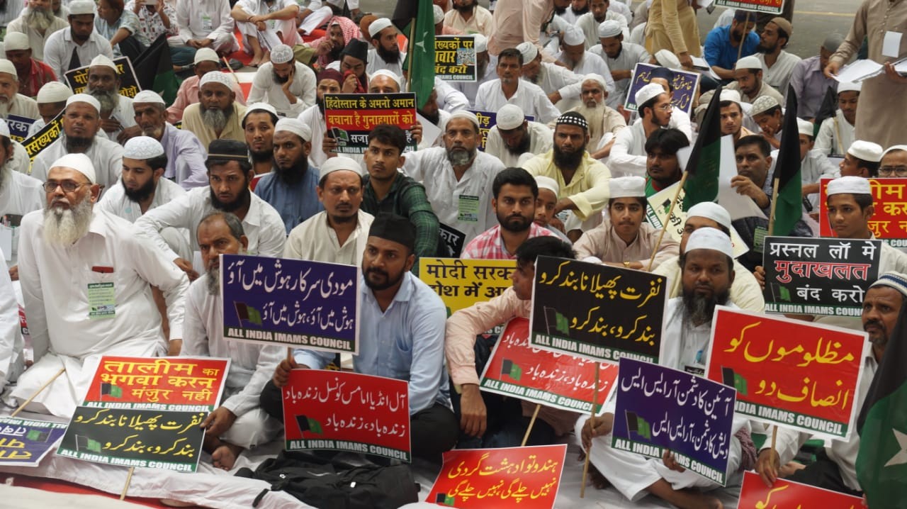 New Delhi: The All India Imams Council (AIIC), a body of Ulemas, Imams and Islamic scholars held Protest March at Jantar Mantar on Wednesday and made several demands including discarding of Tripal Talaq Bill while also urging the centre to stop interfering in Muslim Personal Law.