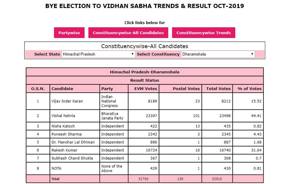 Shimla, Oct 24: The ruling BJP on Thursday won the Dharamshala bypoll in Himachal Pradesh, with its candidate Vishal Nehriya winning by a margin of 6,673 votes.