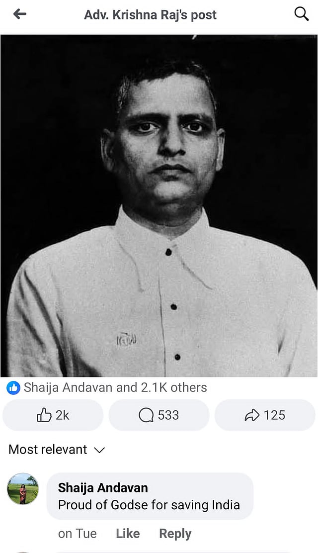 Shaija, a senior faculty member of the Department of Mechanical Engineering at NIT here on January 30 posted a comment on Facebook saying "Proud of Godse for saving India".