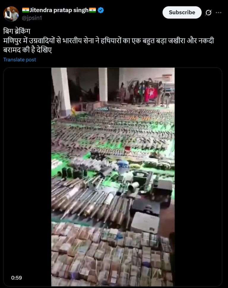 The video was widely shared on X by several users. One such post by an account named @TIgerNS3 on June 10 claimed that the Indian armed forces had recovered “big stocks of guns, arms and ammunition with huge money from anti-liberation social elements of Manipur”, tagging the alleged militants as “Kuki terrorists”. Another user, Jitendra Pratap Singh (@jpsin1), shared the same video earlier with a caption suggesting that it showed a major arms recovery by the Indian Army in Manipur.