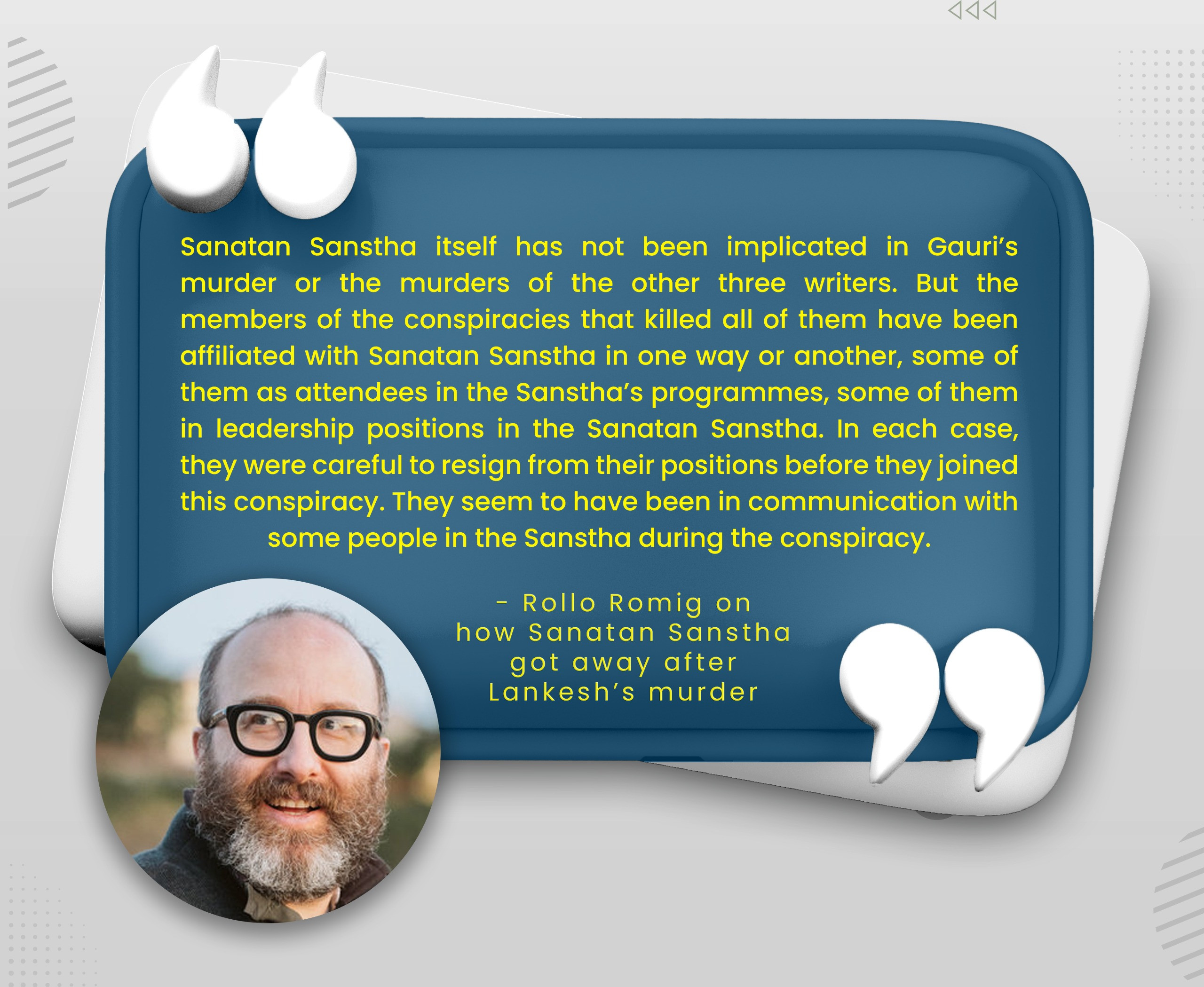 Sanatan Sanstha itself has not been implicated in Gauri’s murder or the murders of the other three writers. But the members of the conspiracies that killed all of them have been affiliated with Sanatan Sanstha in one way or another, some of them as attendees in the Sanstha’s programmes, some of them in leadership positions in the Sanatan Sanstha. In each case, they were careful to resign from their positions before they joined this conspiracy. They seem to have been in communication with some people in the Sanstha during the conspiracy. But the distancing seems to have worked and the Sanstha has not been implicated. Their influence only seems to have grown.