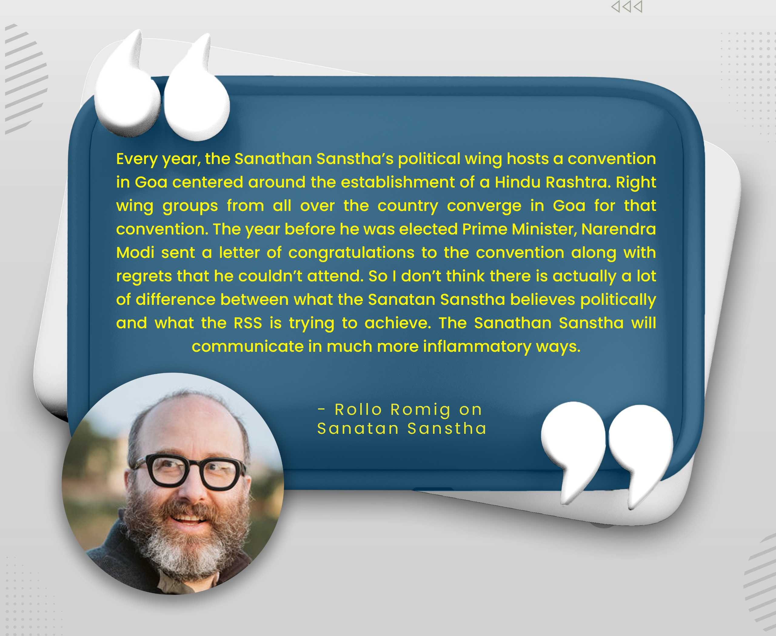A position of an organization like this in a country’s politics is really interesting. We have equivalent organizations like this in the US – these far-right fringe right wing groups that aren’t directly connected to the Republican party, but who play an important role in the ecosystem. Sanatan Sanstha is not part of the Sangh Parivar. Their overt purpose is spiritual and the face they present to the world is of an ashram where people are engaged in meditation, reflection and prayer. But they have an overt political agenda at the same time which is pretty closely aligned with the ruling party (BJP). Every year, the Sanathan Sanstha’s political wing hosts a convention in Goa centered around the establishment of a Hindu Rashtra. Right wing groups from all over the country converge in Goa for that convention. The year before he was elected Prime Minister, Narendra Modi sent a letter of congratulations to the convention along with regrets that he couldn’t attend. So I don’t think there is actually a lot of difference between what the Sanatan Sanstha believes politically and what the RSS is trying to achieve. The Sanathan Sanstha will communicate in much more inflammatory ways. This serves an important purpose too. By speaking in outrageous and inflammatory terms, these fringe groups which aren’t a part of the main organization can keep pushing the limits on what is acceptable to say and then the established organizations can conveniently embrace or distance themselves from the fringe group based on what is convenient for them at the moment.