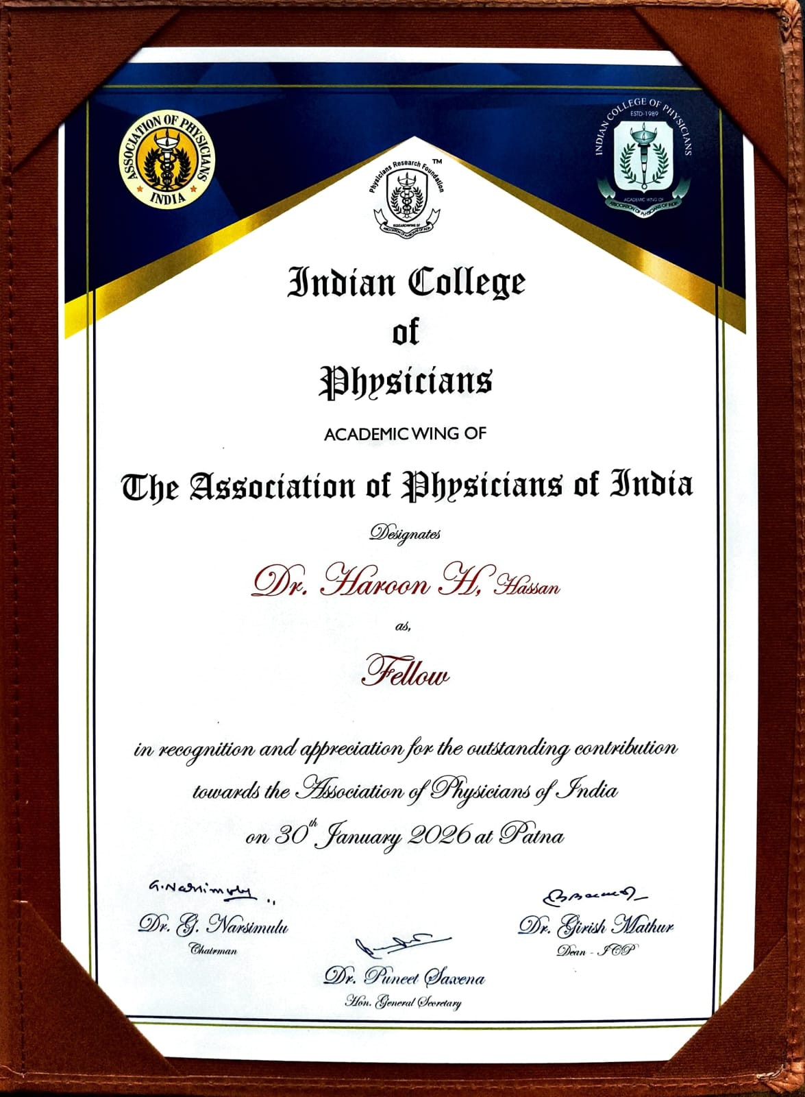 His conferment as a Fellow of the Indian College of Physicians reflects his sustained contribution to clinical practice, academics, and professional leadership at the national level.