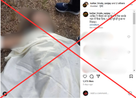 An Instagram user on January 24, shared a post claiming that a Muslim man named Abid killed his wife Neelam and disposed of her body in a suitcase at a canal in Rajasthan.