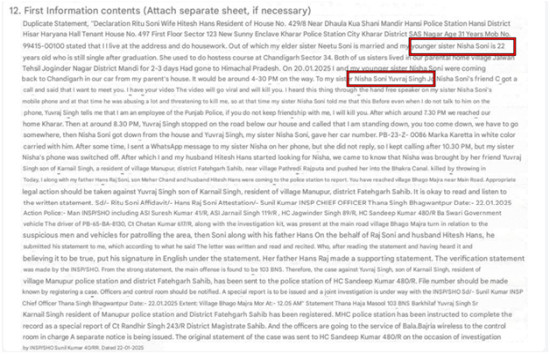 In the next part of investigation, the Desk accessed the FIR copy of the case, wherein the accused has been identified as Yuvraj Singh and the victim as 22-year-old Nisha Soni. Below is a screenshot of the translated FIR copy.