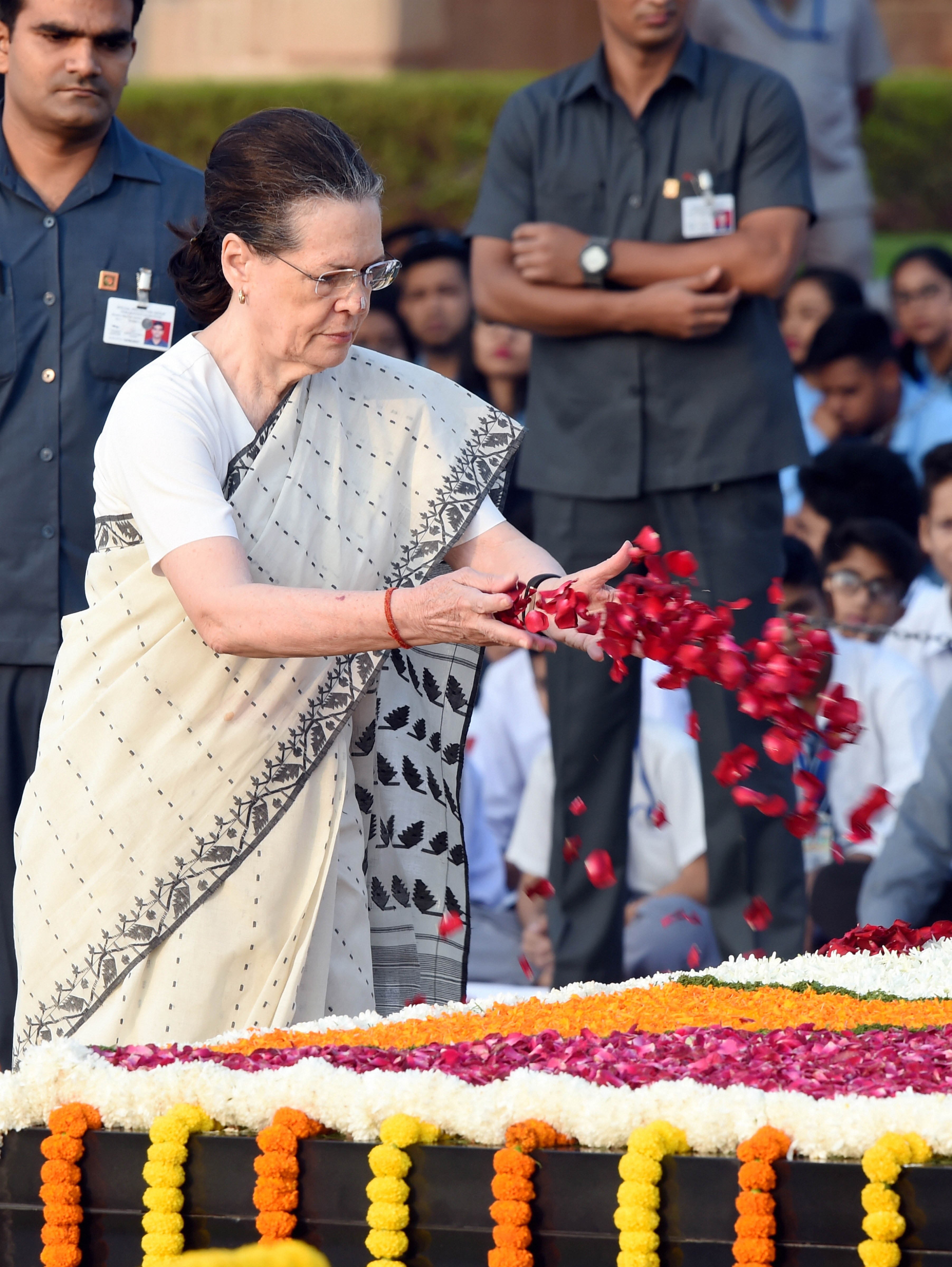 Congress president Sonia Gandhi, former Prime Minister Manmohan Singh, BJP veteran L K Advani, Union ministers Piyush Goyal and Hardeep Singh Puri, and BJP working president J P Nadda were among those who paid floral tributes to the father of the nation.