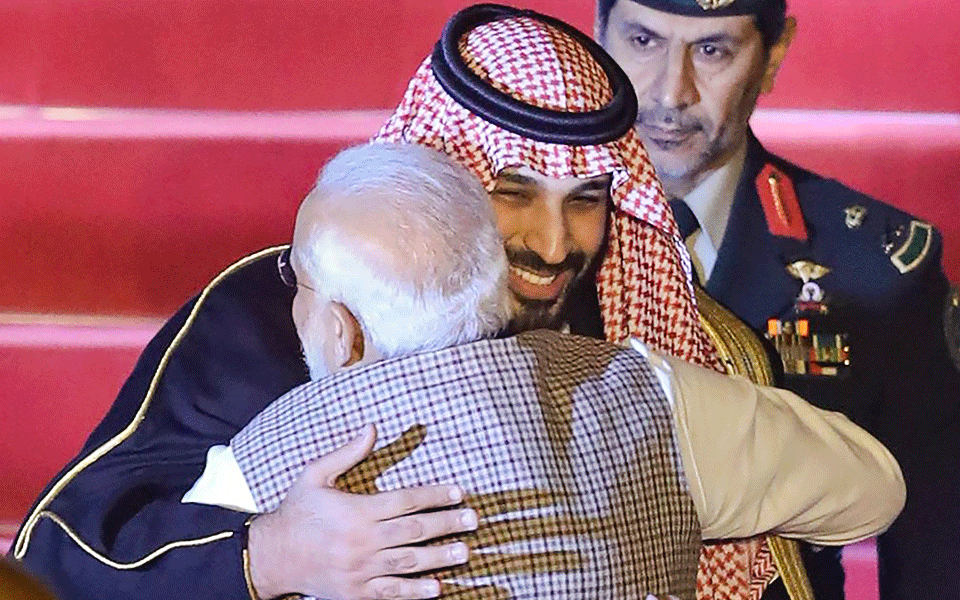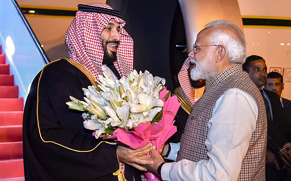New Delhi, Feb 19: In a special gesture, Prime Minister Narendra Modi on Tuesday received at the airport here Saudi Arabia's Crown Prince Mohammed bin Salman, signifying importance India attaches to the visit by the leader of the powerful Gulf nation.