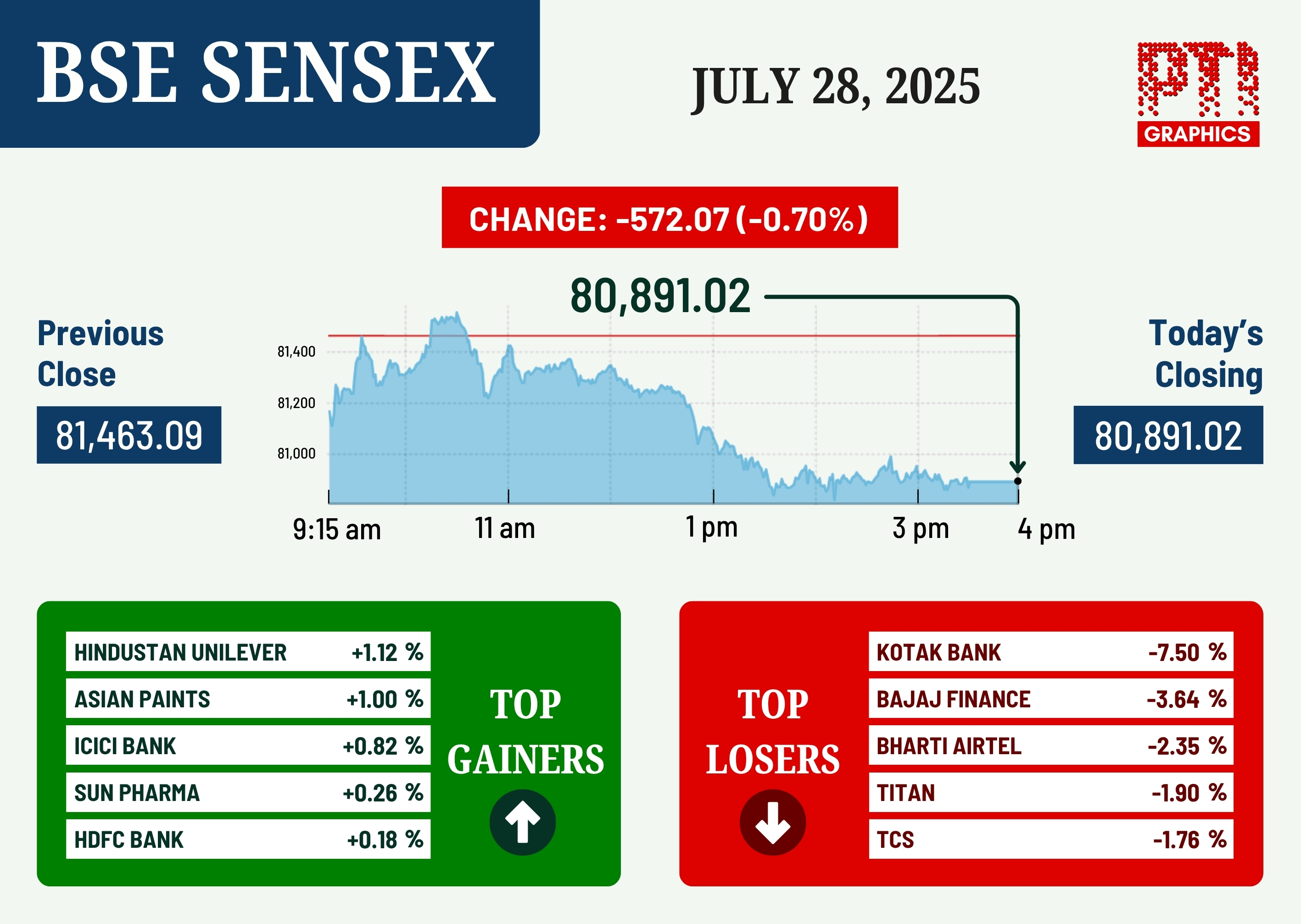 Mumbai, Jul 28 (PTI): Falling for the third straight session on Monday, benchmark Sensex tumbled by 572 points to close at nearly a two-month low due to heavy selling in Kotak Mahindra Bank, forex outflows and uncertainty related to the India-US trade deal.