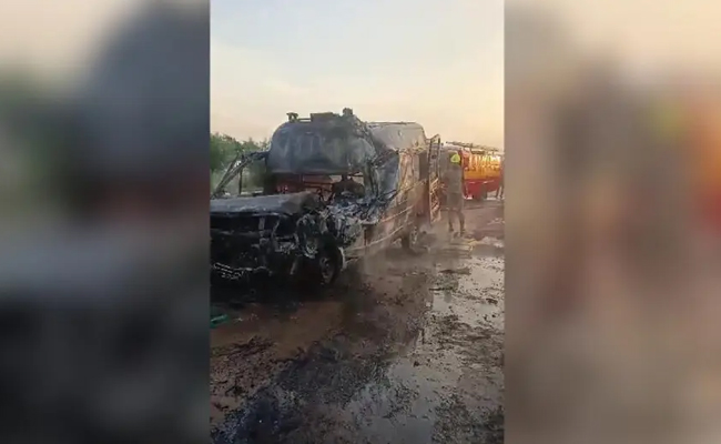 Four people were injured as an ambulance caught fire after colliding with a truck in Odisha's Balasore district on Sunday morning, police said.