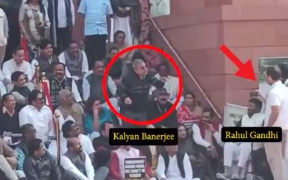 New Delhi: Suspended from Parliament, opposition leaders on Tuesday staged protests on the stairs of the building with Trinamool Congress leader Kalyan Banerjee breaking into an impromptu skit mocking Vice President Jagdeep Dhankhar and Rahul Gandhi making a video of the performance, sparking a political controversy.