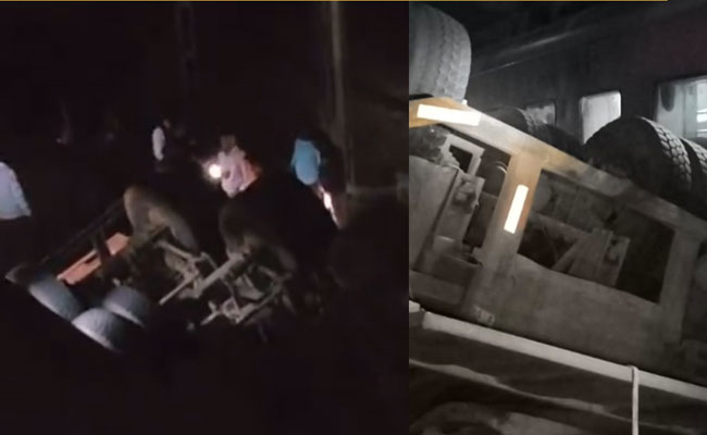 A loaded dumper broke through the railing of an overbridge, and plunged nearly 25 feet onto the railway track near Burhwal junction, leaving the driver seriously injured and disrupting train movement in the area, officials said on Thursday.