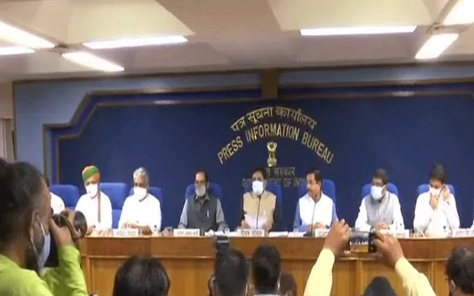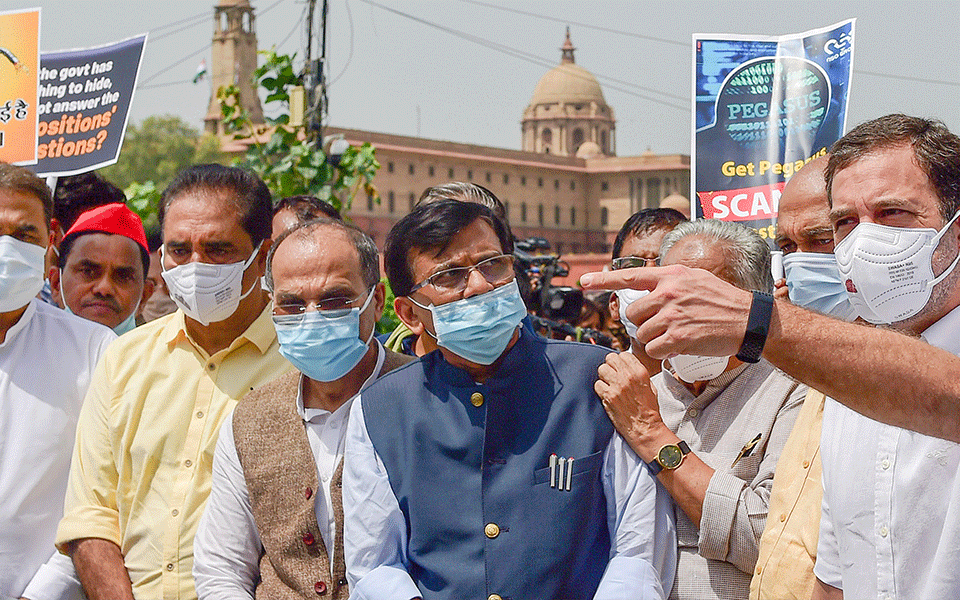 Leaders of several opposition parties on Thursday marched in protest against the government on several issues, including Pegasus, farm laws and alleged manhandling of their MPs in Rajya Sabha, with Congress leader Rahul Gandhi saying the voice of people was crushed in Parliament and democracy was "murdered".