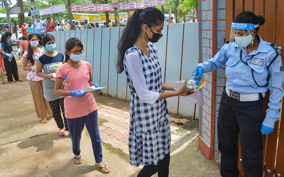 Medical entrance exam NEET began on Sunday amid strict precautions in view of the COVID-19 pandemic at over 3,800 centres across the country with students queuing up as per their designated time slots, adhering to social distancing norms.