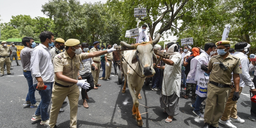New Delhi: Members of the Indian Youth Congress (IYC) on Monday rode a bullock cart to protest against the hike in diesel and petrol prices in the country.