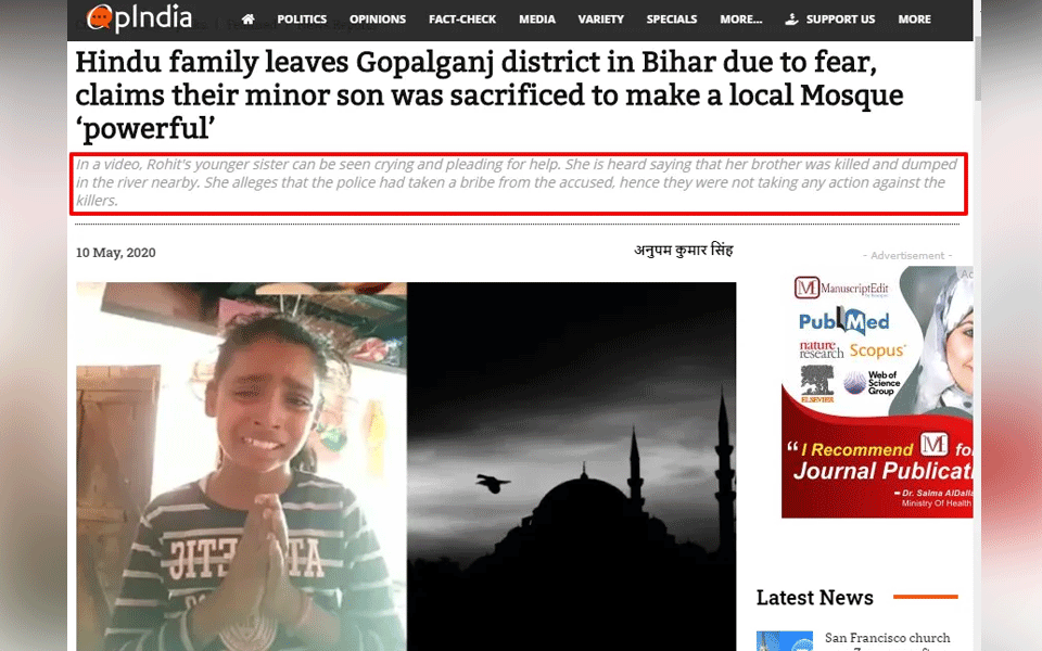 In an article published on May 9, right-wing propaganda website OpIndia claimed that a mosque sacrificed a Hindu boy in Bihar’s Gopalganj.
