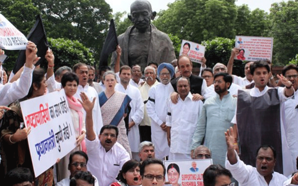 Rahul Gandhi led a protest of senior Congress leaders on the Parliament premises on Friday against the suspension of seven party MPs from the Lok Sabha.