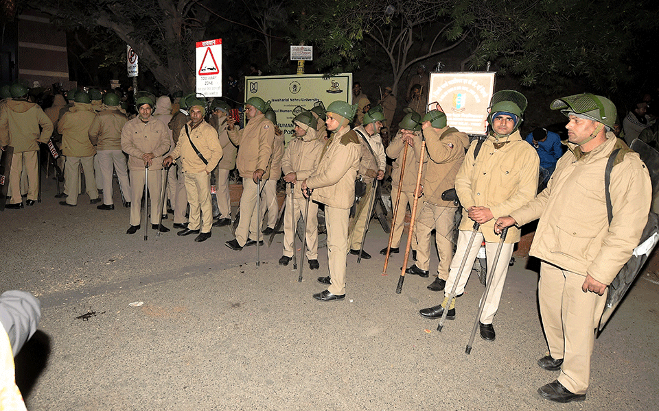 Massive deployment of security personnel remained in place on Monday at Jawaharlal Nehru University, with authorities only allowing students with valid ID cards inside the campus which had witnessed violence.