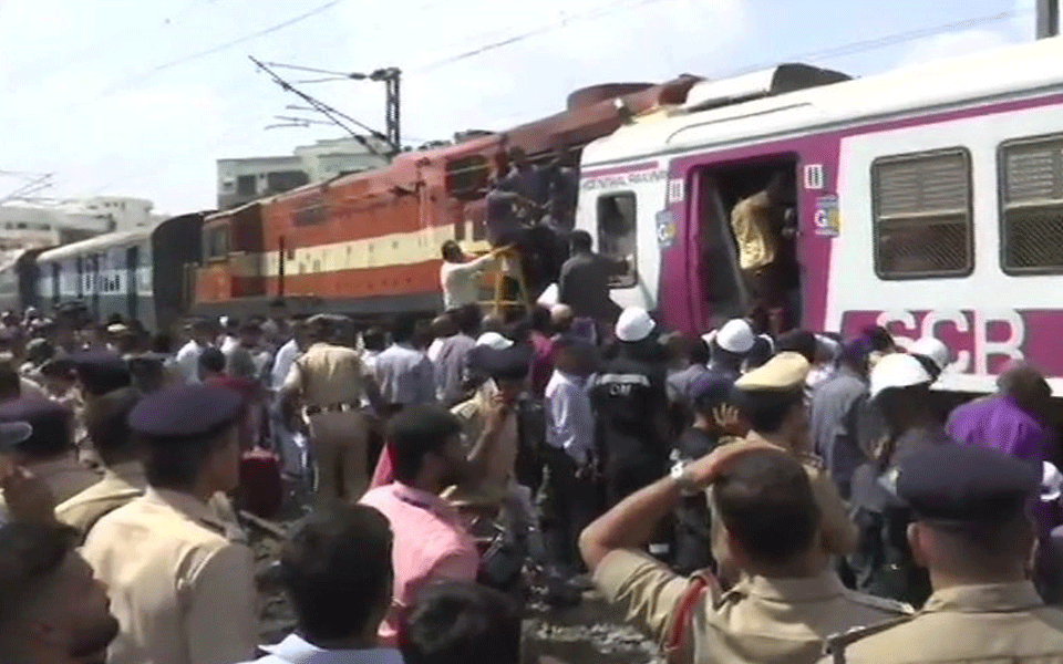 As many as 12 people were injured when two slow-moving trains collided at Kacheguda Railway station here on Monday, South Central Railway officials said.