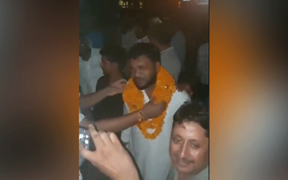 Six men arrested for inciting violence that led to the murder of a police inspector in Bulandshahr last December, were welcomed with garlands by members of right-wing groups after they were released on bail yesterday. Shikhar Agarwal is the chief of the local BJP youth wing. The two others -- Hemu and Upendra Raghav -- are part of a right-wing group. The other three were identified as Jeetu Fauji, Saurav and Rohit Raghav. Cellphone videos shot by local journalists show the men being garlanded as "Jai Shri Ram" slogans are raised.
