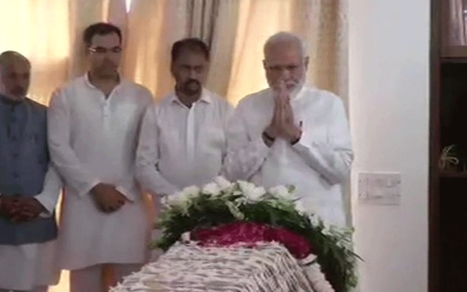 Prime Minister Narendra Modi on Wednesday visited the residence of former union minister Sushma Swaraj and paid his respects.