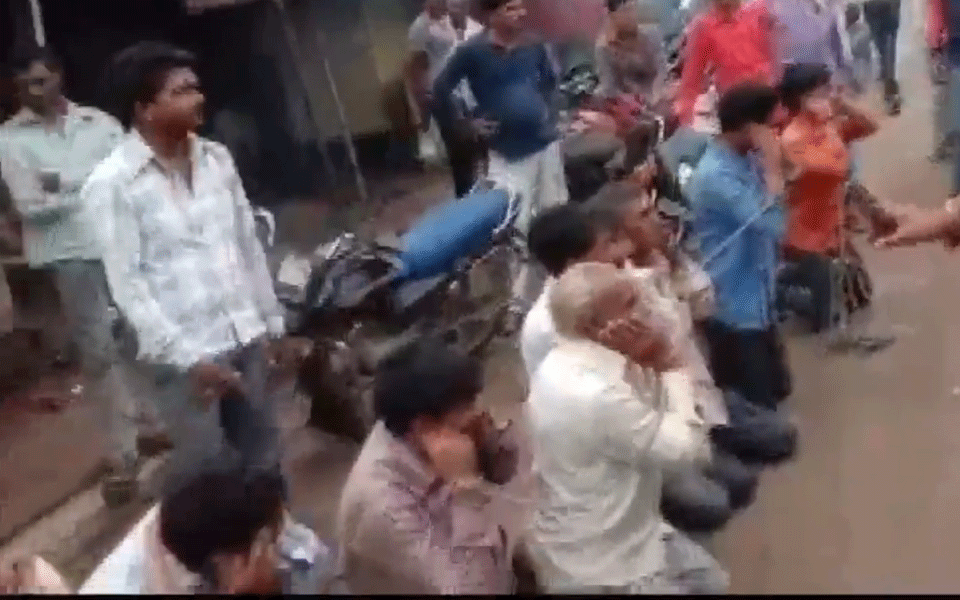 Over 100 villagers tied 25 people with a rope and paraded them through a two-km stretch to a police station in Khandwa district of Madhya Pradesh on Sunday for allegedly transporting cows to Maharashtra, police said.