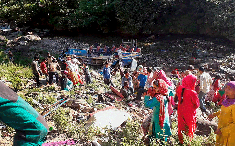 Fourteen persons were killed and as many injured Sunday when the bus in which they were travelling fell into a 150-metre deep gorge in Uttarkashi district, an official said.