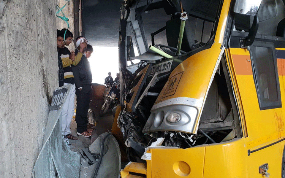 Eighteen people, including 16 children, were injured Saturday when a speeding school bus crashed into a pillar at an underpass here, police said.