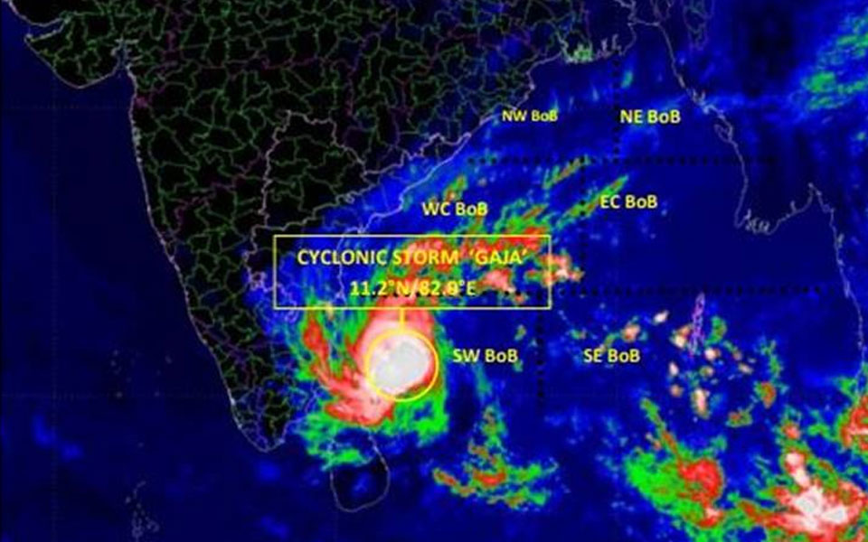 The cyclonic storm 'Gaja' over the Bay of Bengal lay at about 470 km south east from here and is set to make landfall between Cuddalore and Pamban on Thursday evening bringing heavy rainfall to Tamil Nadu.